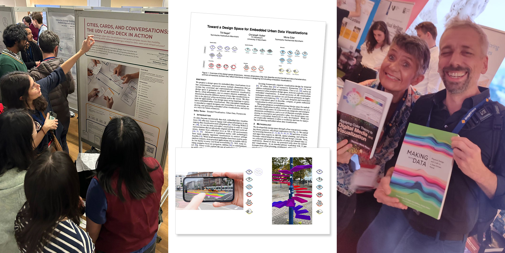 Damla Cay presenting our Urban Data Visualization card deck in the poster session (left), our paper on a design space for embedding visualizations in urban environments (center), and Theresa-Marie Rhyne and Till Nagel holding their books (right).