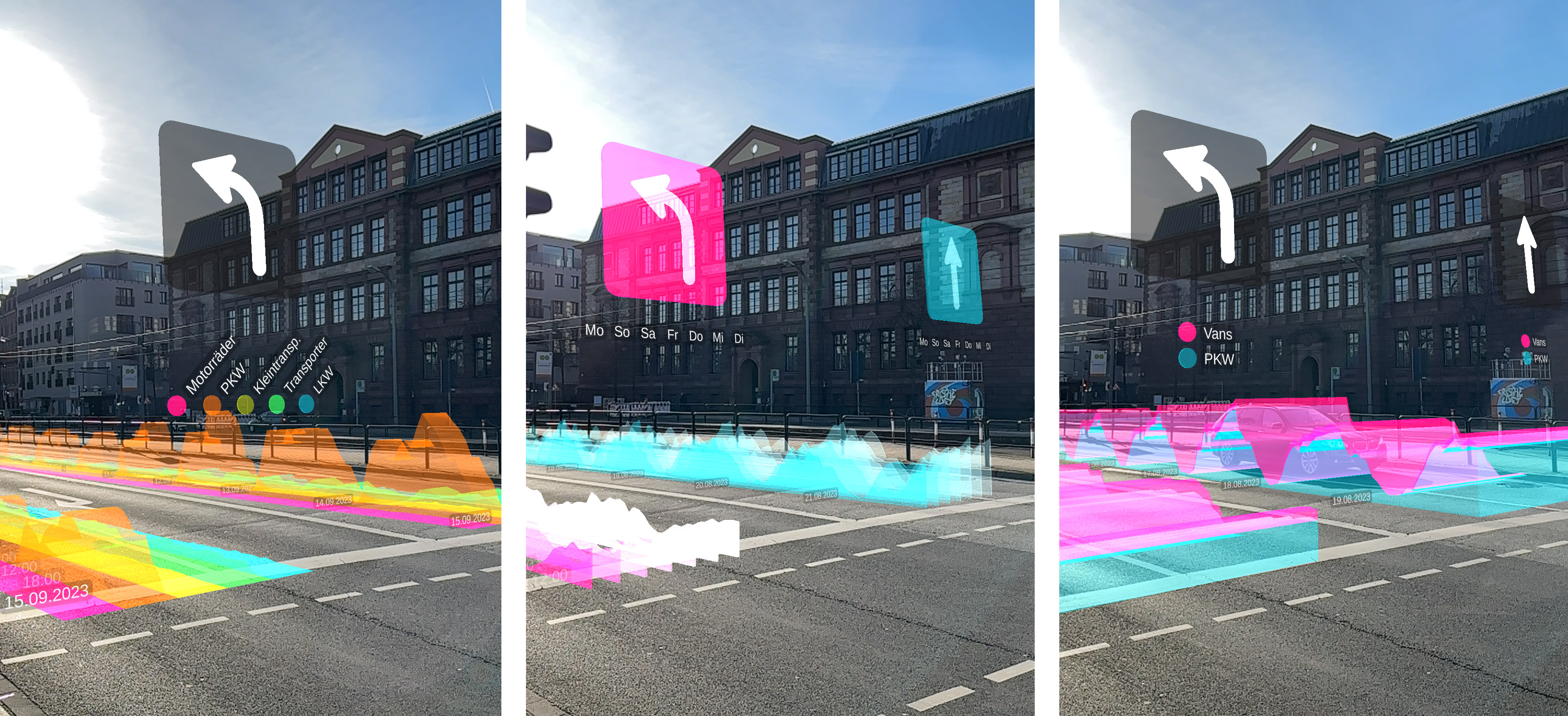 In our demonstrator, we chose street-level traffic such as cars, motorcycles, and trucks, due to their prevalence in central urban locations and their proximity to pedestrians. We used computer-vision based tracking systems installed at locations that track and classify individual vehicles into traffic categories from our Smart City project in Mannheim.