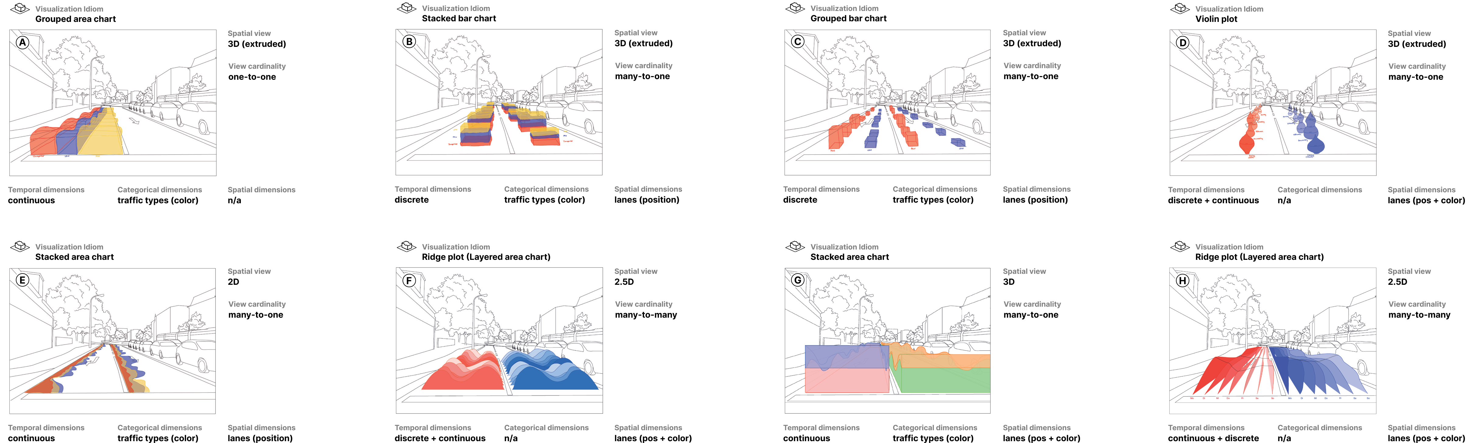 Explorations of various visualization idioms for the case of traffic data embedded into the street lanes, ranging from continuous grouped area charts, to discrete stacked bar charts, to grouped bar charts, to violin plots, to flat area charts, to layered area charts for multiple time axes.
