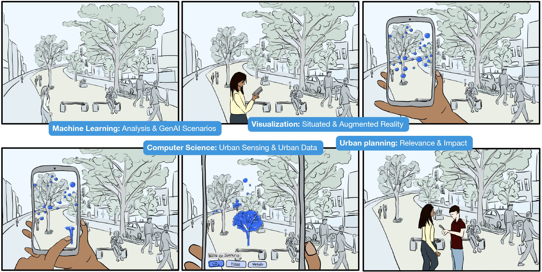 Storyboard of an example scenario in our research project: Sophie checks the air quality in front of her house in real-time using her smartphone. With a quick gesture, she suggests sustainable measures and discusses their potential impacts with her neighbor Ben.