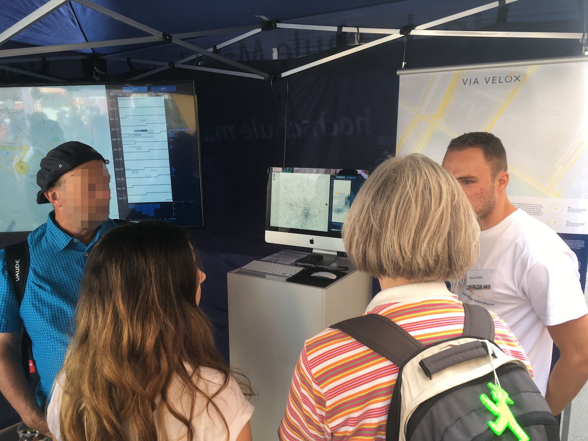 Via Velox was exhibited publicly at a large urban festival (Fig. 5). This bicycle festival celebrated the 200th anniversary of the invention of the bike in Mannheim, and was open to the public. Our goal was to demonstrate Via Velox to interested people, to encourage cyclists to participate in our project by tracking their rides, and to discuss bike related themes with the public. As citizens could test the working visualization prototype, we also gathered first informal feedback