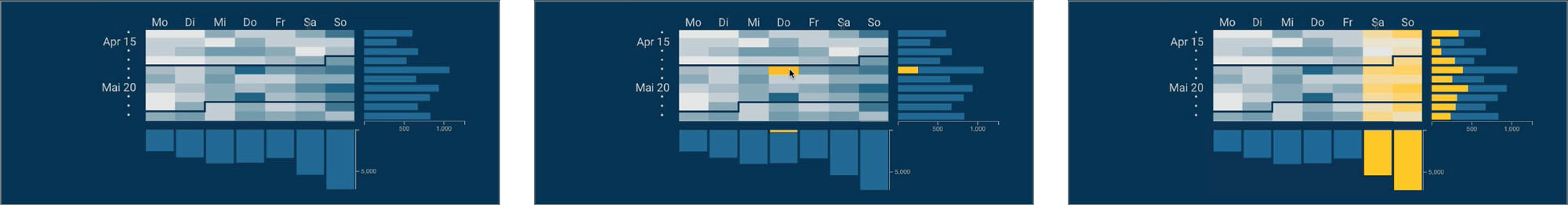 Calendar heatmap with histograms (detail, left). Users can select time spans via the calendar by clicking on single cells (center), or by select-dragging the mouse over the matrix. On the right, Saturday and Sunday were selected to analyze weekend cycling behaviour. After selecting time ranges, the histograms on each side get updated, as well. In this way, the highlighted parts of the histogram bars enable comparing the frequency of trips in a selected time range with the overall frequency.