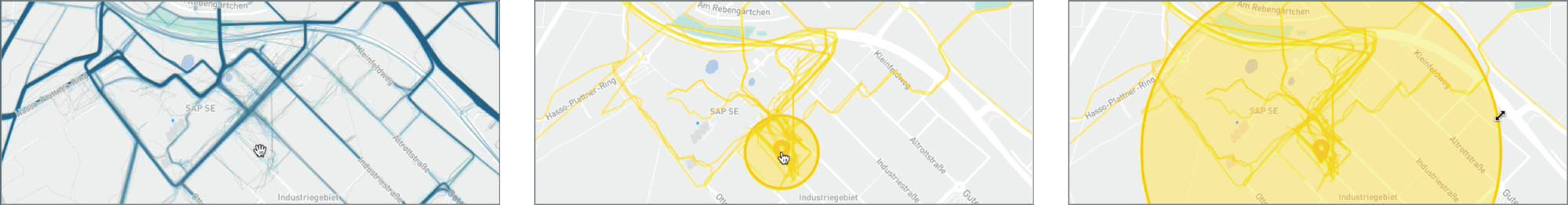 The interactive map can be zoomed and panned to investigate areas of interest. Blue trajectories show all recorded trips without any filters applied (left). By clicking anywhere on the map, users can select areas to filter bike trips which started or ended there. A translucent yellow circle is displayed whose size encompasses the geographic area of interest (center). Users can use direct manipulation to change these filters. By dragging the border of the circle, people can adapt the size of the circle to show more or fewer cycling paths (right).
