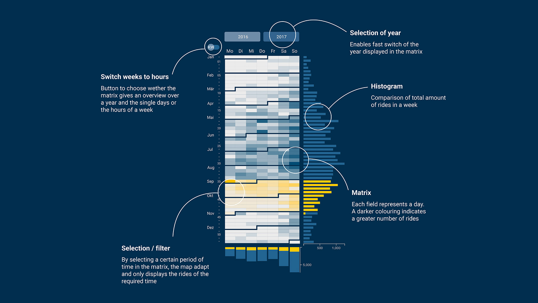 Users can select time spans via the matrix. For instance, they can select all workdays, or choose specific times of day. Two histograms on the sides show aggregated frequency of trips for each weekday, and for each week. Highlighted histogram bars enable comparing the frequency of trips in a selected time with the overall distribution of all bike trips.