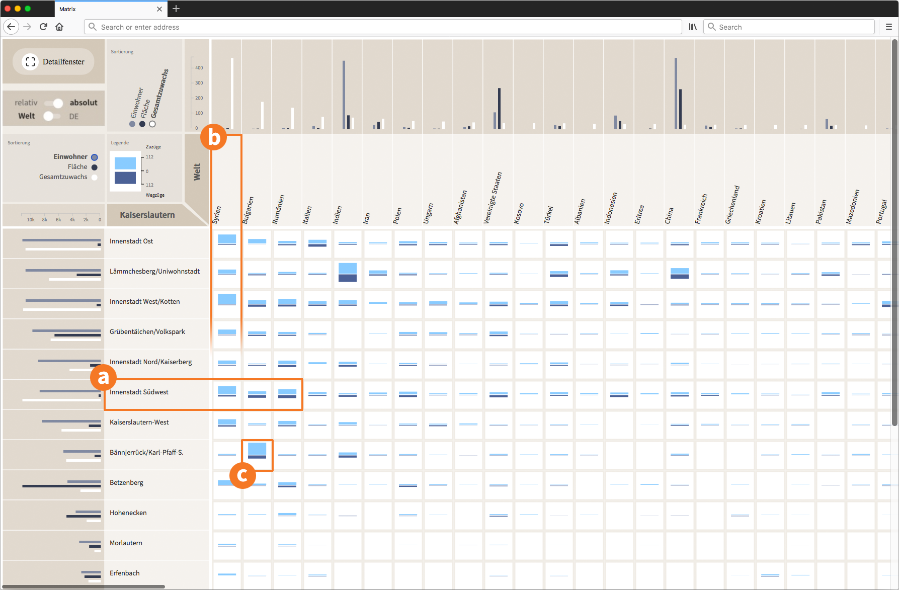 Horizontal patterns draw attention to districts with notable movement characteristics, e.g. Innenstadt-Südwest, in which most persons from the top 3 citizenships move to or from (Fig. 1a). Vertical patterns point to citizenships with unusual movement characteristics, e.g. many Syrians move to Kaiserslautern, see Fig. 1b. The glyph of a single cell is noticeable particularly when it differs from their neighboring cells. For instance, in Fig. 1c it becomes apparent that in contrast to people with other citizenships, more Bulgarians move to Bännjerrück.