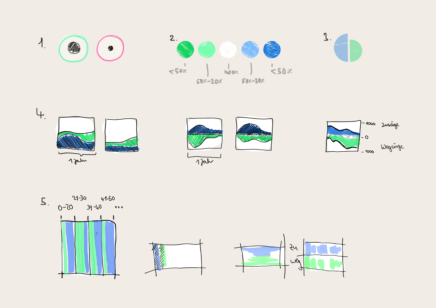 We investigated a variety of glyph designs visualizing in- and outflows. Variants of showing incoming and outgoing inhabitants combine inner circle and outer ring (1), a bivariate color schema (2), and simply split in two proportionally sized half circles. The small stacked area charts visualizes the change over a year (4). Another idea was to group the population movements to additionally show age distributions (5).