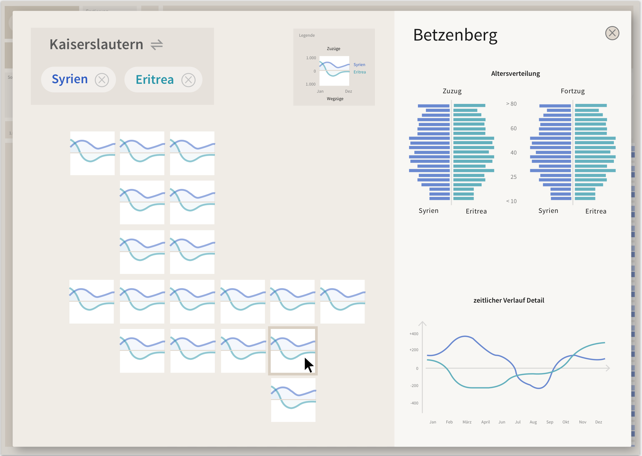 The main view of the prototype consists of an interactive matrix showing population change. Each cell visualizes people moving to and from urban districts, separated by their citizenship.
